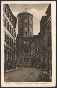 Kolekcja Tomasza Niewodniczańskiego. Rotograwiura w sepii, 14x9 cm. Pocztówka z serii " Pommersche Heimatschutzkarten Stettin Stadt", oprac. przez Urząd Miasta Szczecina (Magistrat Stettin), bez obiegu pocztowego. Widok z dzisiejszej ulicy Grodzkiej (Fuhrstrasse) na Wieżę Więzienną Zamku Książąt Pomorskich (Königliche Schloss). Większość zabudowań przy ul. Grodzkiej (Fuhrstrasse) już nie istnieje.