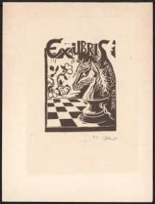 Linoryt, 8,2x6,2 cm. Kompozycja otwarta, na pierwszym planie pole szachowe, na nim figura skoczka, po lewej motyw kwiatowy, na ekslibrisie u góry napis Ex Libris, po prawej nazwisko i imię osoby, której grafika jest dedykowana "Janusza Poźniaka", kolorystyka czarno-biała. Kolekcja Ludwika Piosickiego.