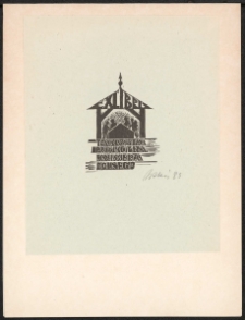 Linoryt, 5,4x4,2 cm. Kompozycja otwarta, na ekslibrisie studnia na rynku miasta, przy niej cztery postacie ludzkie, u góry wkomponowany w dach napis "Ex Libris", u dołu napis "Towarzystwa Przyjaciół m. Kazimierza Dolnego", kolorystyka czarno-biała. Kolekcja Ludwika Piosickiego.