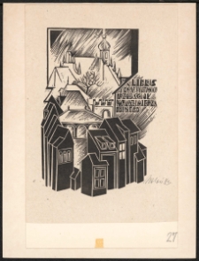 Linoryt, 11,4x8 cm. Kompozycja otwarta, na ekslibrisie widok na Kazimierz Dolny, u góry kościół farny św. Jana Chrzciciela i Bartłomieja Apostoła na ul. Zamkowej, po prawej napis "Ex Libris Towarzystwa Przyjaciół miasta Kazimierza Dolnego", kolorystyka czarno-biała. Kolekcja Ludwika Piosickiego.