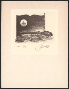Akwaforta : akwatinta, 6x8,3 cm. Kompozycja otwarta, na ekslibrisie pejzaż nocą, u góry po lewej kula księżyca w środku widok zamojskiego ratusza, u dołu kompozycji napis "Ex libris", po prawej od dołu do góry nad drzewami napis "Muzeum Okręgowe w Zamościu", kolorystyka czarno-biała. Kolekcja Ludwika Piosickiego.