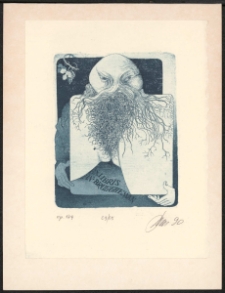 Akwaforta : akwatinta, 9,5x7,2 cm. Kompozycja zamknieta, na ekslibrisie zdeformowana twarz postaci, z której wychodzą korzenie rośliny zakrywające łono kobiety, postać trzyma w rękach ten widok w formie prostokąta, pod spodem napis "Ex libris Jan Bruggheman", po lewej u góry ornament roślinny, kolorystyka czarno-niebiesko-biała. Kolekcja Ludwika Piosickiego.