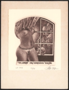 Akwatinta : akwaforta, 10x8,3 cm. Kompozycja otwarta, na ekslibrisie roznegliżowana kobieta ściągająca odzież, po prawej za oknem pięć twarzy starców podglądających kobietę, na jej biodrach napis " Vanitas vanitatum, et omnia vanitas", pod kompozycją napis "Ex libris Dr. Hermann Wiese", kolorystyka wielobarwna. Kolekcja Ludwika Piosickiego.