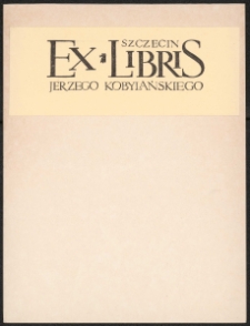 Cynkotypia, 2,8x8,87 cm. Kompozycja prostokątna, na ekslibrisie napis "Ex libris, pomiędzy tymi wyrazami miniatura gryfa, nad napisem "Szczecin', pod spodem "Jerzego Kobylańskiego", kolorystyka czarno-biała. Kolekcja Ludwika Piosickiego.