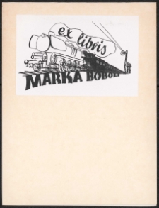 Cynkotypia, 5,5x9,7 cm. Kompozycja prostokątna, na ekslibrisie lokomotywa ze składem pociągu, po prawej semafor, nad lokomotywą napis "Ex libris", u dołu kompozycji napis " Marka Boboli", kolorystyka czarno-biała. Kolekcja Ludwika Piosickiego.