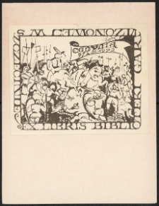 Cynkotypia, 8,6x11,1 cm. Kompozycja zamknięta, na ekslibrisie według fantazji artysty scena walki wojsk polskich z niemieckim po Cedynią, po prawej na wstędze napis " Cedynia 972-1972", po obwodzie kompozycji od prawej do lewej napis " Ex libris Biblioteki Garnizonowej w Szczecinie", kolorystyka czarno-biała. Kolekcja Ludwika Piosickiego.