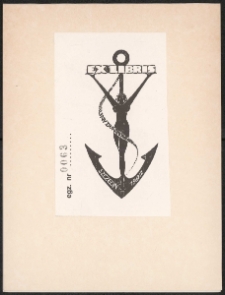 Cynkotypia, 9 x 3,5 cm. Kompozycja otwarta, na ekslibrisie kotwica, na niej naga kobieta z rękami rozpostartymi do góry, które przytrzymują napis "Ex libris", na kotwicy u dołu napis " Szczecin 1992", z góry do dołu spiralnie napis "Aliny Dunin", kolorystyka biało-czarna. Kolekcja Ludwika Piosickiego.