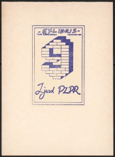 Cynkotypia barwna, 9x5,8 cm. Kompozycja zamknięta, na ekslibrisie liczba 9 złożona z białych cegieł, na zewnętrznej i wewnętrznej stronie tego elementu kompozycji odcień w kolorze fioletowym, u góry napis " Ex libris Klub Garnizonowy Szczecin 1981", u dołu napis " Zjazd PZPR", kolorystyka biało-fioletowa. Kolekcja Ludwika Piosickiego.