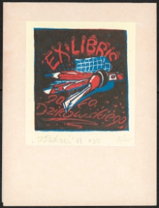 Linoryt kolorowy, 9x8,1 cm. Kompozycja zamknięta, na ekslibrisie akcesoria grafika: ołówek, nóż do papieru i tubka tuszu, leżące na papierze w kratkę, nad nimi napis " Ex libris", pod nimi napis " Jacka Dzikowskiego", kolorystyka wielokolorowa. Kolekcja Ludwika Piosickiego.