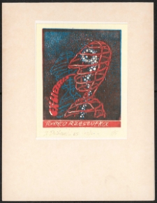 Linoryt kolorowy, 8,7x6,8 cm. Kompozycja zamknięta, na ekslibrisie portrety dwóch postaci wykonanych z drutów na czarnym tle z niebieskimi kropkami, z ust postaci po prawej wylatują litery składające się na napis " Ex libris", u dołu kompozycji na czerwonym pasku napis "Tomka Rzeszutka", kolorystyka wielokolorowa. Kolekcja Ludwika Piosickiego.