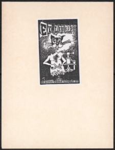 Linoryt, 7,7x4,7 cm. Kompozycja zamknięta, na ekslibrisie postać męska z głową kota trzymająca dłuto grraficzne, za nią prasa graficzna, u góry kompozycji napis "Ex libris", u dołu napis " Ex libris Pawła Szydło", nad napisem leżące drugie dłuto graficzne, kolorystyka czarno-biała. Kolekcja Ludwika Piosickiego.