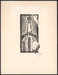 Linoryt, 9,2x4,3 cm. Kompozycja zamknięta, na ekslibrisie elementy ekslibrisu tworzą rękojeść miecza, w dolnej jego części napis "Ex libris", wyżej napis "Miecznik", u dołu po lewej litera "J', po prawej rozłożona otwarta księga, kolorystyka czarno-biała. Kolekcja Ludwika Piosickiego.