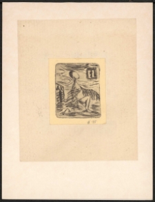 Sucha igła, 5 x 4 cm. Kompozycja zamknięta, na ekslibrisie klęcząca postać ze skrzydłami zamiast rąk, u góry w prawym górnym rogu napis "EL", po lewej budowla architektoniczna z napisem " A K", kolorystyka czarno-biała. Kolekcja Ludwika Piosickiego.