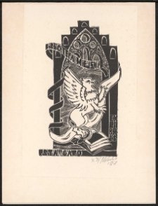 Linoryt, 11,7x6,4 cm. Kompozycja zamknięta, na ekslibrisie fantazyjny widok elewacji frontowej Książnicy Stargardzkiej na ul. Mieszka I w Stargardzie, na tle elewacji na wstędze napis "Biblioteka Miejska" oraz gryf siedzący na otwartej książce, na dole po prawej napis "Ex libris", po lewej napis "Stargard", kolorystyka czarno-biała. Kolekcja Ludwika Piosickiego.
