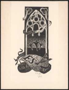 Linoryt, 13,1x7,1 cm. Kompozycja otwarta, na ekslibrisie widok okna w stylu gotyckim, a w nim trzy postacie fantastyczne, u dołu kompozycji paleta malarska z pędzlami i dzieło malarskie z motywem takim samym jak widok w oknie w stylu gotyckim, na palecie napis "E. S.", po lewej na wstążce napis "Ex libris", kolorystyka czarno-biała. Kolekcja Ludwika Piosickiego..