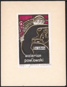 Drzeworyt,10,1x6,2 cm. Kompozycja zamknięta, na ekslibrisie po prawej twarz mężczyzny obejmującego postać nagiej kobiety, nad jego ręką klucz wiolinowy, z prawej od postaci kobiety napis "Ex libris", niżej napis "Walerian Pawłowski", kolorystyka barwna. Kolekcja Ludwika Piosickiego.