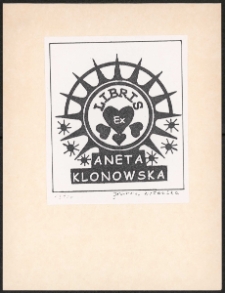 Kserokopia, 9x8 cm. Kompozycja zamknięta, na ekslibrisiey figura przypominająca koło zębate, po jej lewej i po prawej stronie trzy elementy kompozycji w kształcie słoneczka, w polu koła cztery serduszka, na największym z nich napis "Ex", nad nim napis "libris", u dołu kompozycji napis "Aneta Klonowska", kolorystyka czarno-biała. Kolekcja Ludwika Piosickiego.