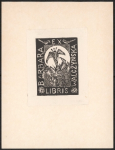 Drzeworyt, 6,7x4,9 cm. Kompozycja zamknięta, na ekslibrisie na czarnym tle prostokąt, w jego polu kwiaty, na ich tle motyl, nad prostokątem w górnej części kompozycji napis "Ex" i po obu stronach ptaki, po lewej stronie prostokąta pionowo napis "Barbara", po prawej stronie pionowo napis "Walczyńska", w dolnej części kompozycji napis "libris" i po obu stronach motywy kwiatowe, kolorystyka czarno-biała. Kolekcja Ludwika Piosickiego.