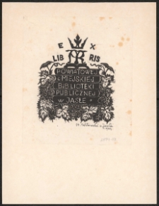 Drzeworyt, 7,7x6,7 cm. Kompozycja otwarta, na ekslibrisie pięć książek tworzących stertę, na której stoi element herbu Jasła: monogram królewski JAR (Joannes Albertus Rex), a na nim korona królewska o formie gotyckiej, u góry napis "Ex" przedzielony koroną, niżej napis "libris" przedzielony monogramem, na stercie książek napis " Powiatowej i Miejskiej Biblioteki Publicznej w Jaśle", wokół sterty motyw roślinny, kolorystyka czarno-biała. Kolekcja Ludwika Piosickiego.