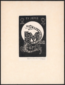 Drzeworyt, 8,6x5,7 cm. Kompozycja prostokątna, na ekslibrisie u góry napis "Ex libris", po lewej i po prawej na czarnym tle puchary z wężem, który je oplata, niżej w polu białego koła i poza nim na czarnym tle wąż, i napis "Jerzy Mac", kolorystyka czarno-biała. Kolekcja Ludwika Piosickiego.