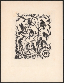 Drzeworyt, 9,9x8 cm. Kompozycja otwarta, na ekslibrisie wróble na gałązkach, po prawej w dolnej części kompozycji napis "1971", w białym polu koła zębatego napis "PF", kolorystyka czarno-biała. Kolekcja Ludwika Piosickiego.