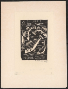 Drzeworyt, 8,1x5,5 cm. Kompozycja otwarta, na ekslibrisie na czarnym tle cztery ryby, po lewej na żyłce spławik z haczykiem, nad rybami napis "Ex libris", w dolnej części napis "Michał Czajka", kolorystyka czarno-biała. Kolekcja Ludwika Piosickiego.