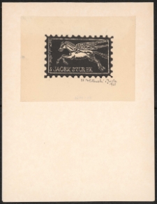 Drzeworyt, 3,8x6,1 cm. Kompozycja zamknięta, na ekslibrisie ramka w znaczku pocztowym,w niej na czarnym tle skrzydlaty koń (Pegaz), po lewej z góry na dół napis "Ex libris", w dolnej części kompozycji napis " Jacek Szurek", kolorystyka czarno-biała. Kolekcja Ludwika Piosickiego.