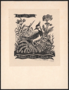 Drzeworyt, 9x8,2 cm. Kompozycja otwarta, na ekslibrisie ptak czajka wśród roślin, u góry po lewej na wstędze napis "Ex libris", w dolnej części kompozycji na wstędze napis "Bronisław Czajka", kolorystyka czarno-biała. Kolekcja Ludwika Piosickiego.