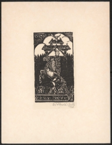 Drzeworyt, 8,5x4,8 cm. Kompozycja zamknięta, na ekslibrisie wierzgający koń, wyżej postać ludzka na tle płotu i bramy wjazdowej na teren posesji, u góry czaszka jelenia na drugim elemencie bramy, w dolnej części kompozycji ksiażka, na niej dwa dzbany, kolorystyka czarno-biała. Kolekcja Ludwika Piosickiego.