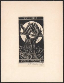 Drzeworyt, 10x5,5 cm. Kompozycja zamknięta, na ekslibrisie sowa siedząca na gałęzi drzewa na tle księżyca w kolorze białem, w górnej części kompozycji napis "Ex libris", w dolnej napis "Danuty Macowej", kolorystyka czarno-biała. Kolekcja Ludwika Piosickiego.