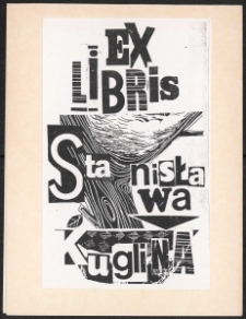 Cynkotypia, 14,5x8,7 cm. Kompozycja prostokątna, na ekslibrisie kolaż różnych motywów: drzewo i fragmenty ubioru, u góry napis "Ex libris", na tle kolażu napis "Stanisława Kuglina", kolorystyka czarno-biała. Kolekcja Ludwika Piosickiego.