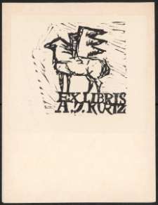 Linoryt, 8 x 8,2 cm. Kompozycja otwarta, na ekslibrisie koń ze skrzydałami, w dolnej części napis " Ex libris A. J. Kurtz", kolorystyka czarno-biała. Kolekcja Ludwika Piosickiego.