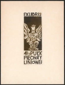 Linoryt, 10,9 x 4 cm. Kompozycja prostokątna, na ekslibrisie według fantazji artysty w polu prostokąta orzeł biały z koroną na głowie na czarnym tle, nad kompozycją napis "Ex libris", pod kompozycją napis " 4 Pułk Piechoty Liniowej", kolorystyka czarno-biała. Kolekcja Ludwika Piosickiego.