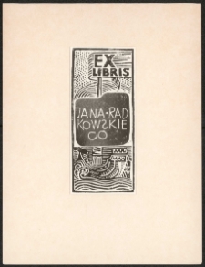 Linoryt, 9,6x4,2 cm. Kompozycja zamknięta, na ekslibrisie w górnej części kompozycji na wstędze napis "Ex libris", niżej napis na czarnym tle "Jana Radkowskiego", w dolnej części kompozycji kadłub żaglowca na obszarze wodnym, kolorystyka czarno-biała. Kolekcja Ludwika Piosickiego.