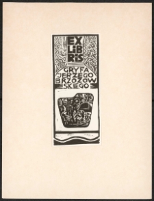 Linoryt, 9,8x4,1 cm.Kompozycja zamknięta, na ekslibrisie element w kształcie butelki, na jej szyjce napis "Ex libris", niżej napis "Gryfa Jerzego Brzozowskiego", w dolnej części kompozycji wielokąt z mechanizmem w środku", kolorystyka czarno- biała. Kolekcja Ludwika Piosickiego.