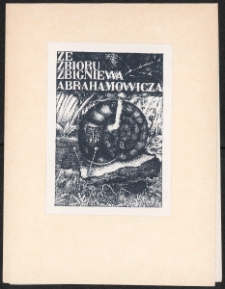 Cynkotypia,9,2x6,2 cm.Kompozycja prostokątna, na ekslibrisie widok ślimaka na liściu na tle łąki, według fantazji artysty muszla ślimaka jest niczym domek dla ludzi, u góry kompozycji napis " Ze zbioru Zbigniewa Abrahamowicza", kolorystyka czarno-biała. Kolekcja Ludwika Piosickiego.
