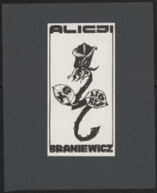 Cynkotypia, 11,8 x 8 cm. Kompozycja otwarta, na ekslibrisie według fantazji artysty róża z dwoma liściami, na nich napis "Ex libris", u góry nad kwiatem napis "Alicji", u dołu napis "Braniewicz", kolorystyka czarno-biała. Kolekcja Ludwika Piosickiego.