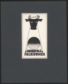 Cynkotypia,9,3x5 cm.Kompozycja prostokątna, na ekslibrisie w ramce u góry głowa byka, z jego oczu wychodzą dwie czarne linie, nad głową byka paragraf, u dołu kompozycji okrąg podzielony na dwie części: górna to czarne pole, dolna to białe pole z czarnymi liniami, niżej napis "Henryka Falkiewicza", kolorystyka czarno-biała. Kolekcja Ludwika Piosickiego.