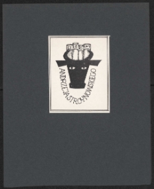 Cynkotypia,7 x 5,5 cm. Kompozycja prostokątna, na ekslibrisie według fantazji artysty byk, u góry między rogami cztery zwoje rękopisów, na nich napis "Ex libris", od lewej do prawej napis "Andrzeja Stroynowskiego", kolorystyka czarno-biała. Kolekcja Ludwika Piosickiego.