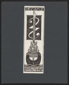 Cynkotypia, 13,5x4 cm. Kompozycja prostokątna, na ekslibrisie według fantazji artysty widok rufy okrętu płynącego na morzu, wyżej tablica w kolorze czarnym z graficznym przedstawieniem paragrafu jako maszt okrętu, u góry napis "Ex libris", u dołu kompozycji napis " Barbary i Michała Wojtalików", kolorystyka czarno-biała. Kolekcja Ludwika Piosickiego.