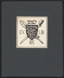 Cynkotypia, 6,8x6,8 cm. Kompozycja w kształcie kwadratu, na ekslibrisie tarcza rycerska na tle miecza i gęsiego pióra, które są skrzyżowane, na tarczy napis "Janusza Czułkowskiego", napis "Ex libris" podzielony na części: po lewej, po prawej i u dołu kompozycji, kolorystyka czarno-biała. Kolekcja Ludwika Piosickiego.