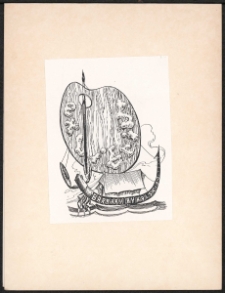 Cynkotypia, 8,8x6,5 cm. Kompozycja otwarta, na ekslibrisie paleta malarska z pędzlem w otworze na kciuk, na palecie napis "Ex libris", niżej namiot i rak, na odwłoku napis "Barbary Rykalskiej", kolorystyka czarno-biała. Kolekcja Ludwika Piosickiego.
