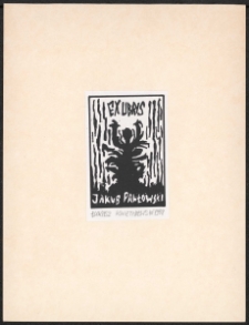 Cynkotypia, 6,2x4,2 cm. Kompozycja prostokątna, na ekslibrisie postać fantastyczna, nad nią napis "Ex libris", u dołu kompozycji napis "Jakub Pawłowski", kolorystyka czarno-biała. Kolekcja Ludwika Piosickiego.