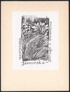 Cynkotypia, 9,7x7 cm. Kompozycja prostokątna, na ekslibrisie rośliny, na ich tle leży szczotka z włosiem, po lewej wyżej napis "Ex libris", po obwodzie prostokąta od lewej do prawej napis "Mirosława Jaworska-Kiraga z Goleniowa", kolorystyka czarno-biała. Kolekcja Ludwika Piosickiego.