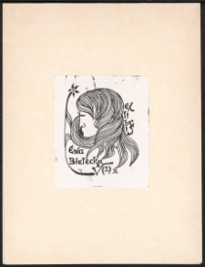 Cynkotypia, 6,2x4,8 cm. Kompozycja prostokątna, na ekslibrisie kobieta z długimi włosami, po prawej napis "Ex libris', u dołu kompozycji napis "Ewa Bielecka" i symbole matematyczne, kolorystyka czarno-biała. Kolekcja Ludwika Piosickiego.