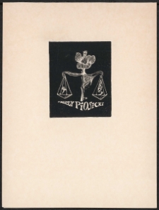 Cynkotypia, 6,5x5,3 cm.Kompozycja prostokątna, na ekslibrisie fantazyjny widok wagi w kształcie kwiatu, na lewym liściu szala z napisem"Ex", na prawym liściu szala z napisem " libris', u dołu kompozycji napis "Jerzy Piosicki", kolorystyka czarno-biała. Kolekcja Ludwika Piosickiego.