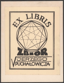 Cynkotypia, 12,5x9,5 cm. Kompozycja prostokątna, na ekslibrisie w ramce w okręgu figury geometryczne, u góry napis "Ex libris", pod okręgiem napis "zbiór", niżej napis pod symbolem matematycznym "Jerzego Puchałowicza", kolorystyka czarno-biała. Kolekcja Ludwika Piosickiego..