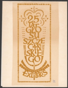 Cynkotypia, 16 x 6,7 cm. Kompozycja zamknięta, na ekslibrisie wedlug fantazji artysty w ozdobnej ramce napis "25 lat Głosu Szczecińskiego", niżej napis "Ex libris", w polu ramki różne elementy ozdobne kompozycji, kolorystyka biało-złota. Kolekcja Ludwika Piosickiego.