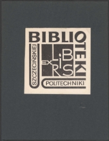 Cynkotypia, 7,2x7 cm. Kompozycja otwarta, na ekslibrisie w polu kwadratu napis "Ex libris", nad nim u góry od lewej w prawo dół napis "Biblioteki", po lewej w polu graficznego przedstawienia trzonu książki napis "Szczecińskiej", u dołu kompozycji w polu graficznego przedstawienia trzonu innej książki napis "Politechniki", kolorystyka czarno-biała. Kolekcja Ludwika Piosickiego.