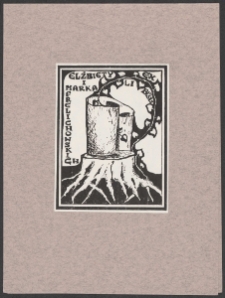 Cynkotypia, 8,5x6,5 cm. Kompozycja prostokątna, na ekslibrisie pień drzewa, na nim rulon papieru, po prawej ornament roślinny i na jego tle u góry napis "Ex libris", po lewej napis "Elżbiety i Marka Frelichowskich", kolorystyka czarno-biała. Kolekcja Ludwika Piosickiego.